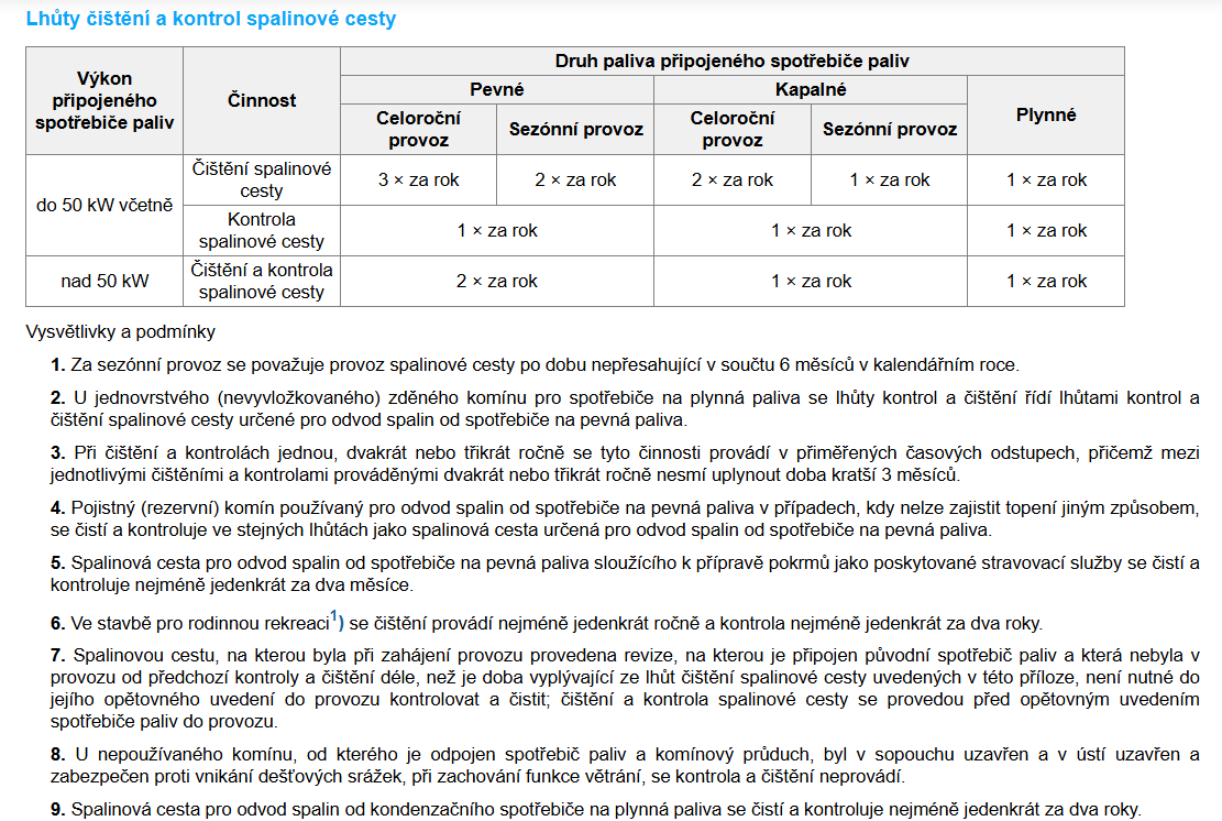 V následující tabulce máte uvedeny lhůty čištění a kontrol spalinové cesty včetně případných vysvětlivek a podmínek: